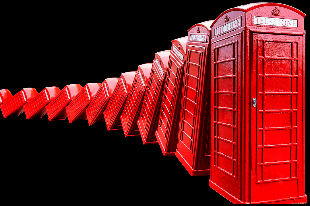 12 Tumbling Phone Booths – Teil der CONTEMP-Serie, digitale Fotocollage des „Out of Order“ Werkes von David March in London aus einer modifizierten Perspektive