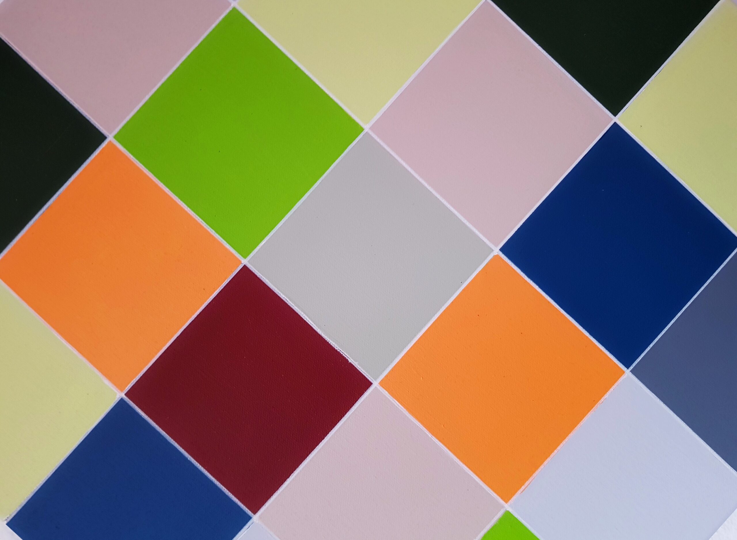 Acrylmalerei auf Leinwand, die in einem Quadratraster von 5 x 5 Unterquadraten mehrere Spannungsaufgaben konstruktiv aufzulösen sucht : Den Farbe-an-sich Kontrast, den Hell-Dunkel Kontrast – sowie durch unterschiedliche Anzahl der verschiedenfarbigen Untergruppen den Quantitativkontrast. Durch Anordnung der Teilflächen einer ausgewählte Farbuntergruppe zu einer primären Figur, die in harmonischem oder kontrastiv-dynamischem Spannungsverhältnis zu dem Grund der sie umgebenden sekundären Teilflächen steht, ergibt sich die Gesamtkomposition