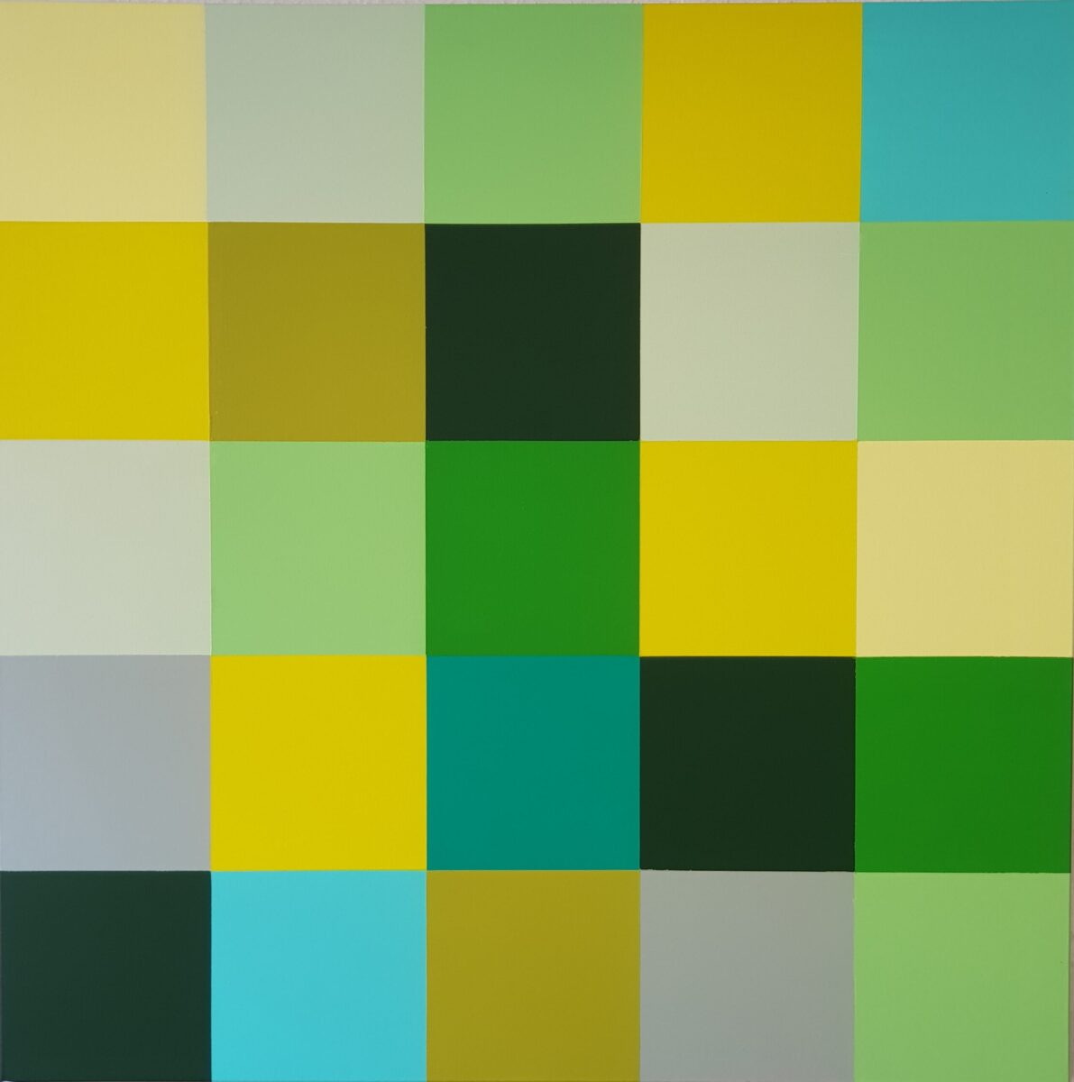 Acrylmalerei auf Leinwand, die in einem Quadratraster von 5 x 5 Unterquadraten mehrere Spannungsaufgaben konstruktiv aufzulösen sucht :