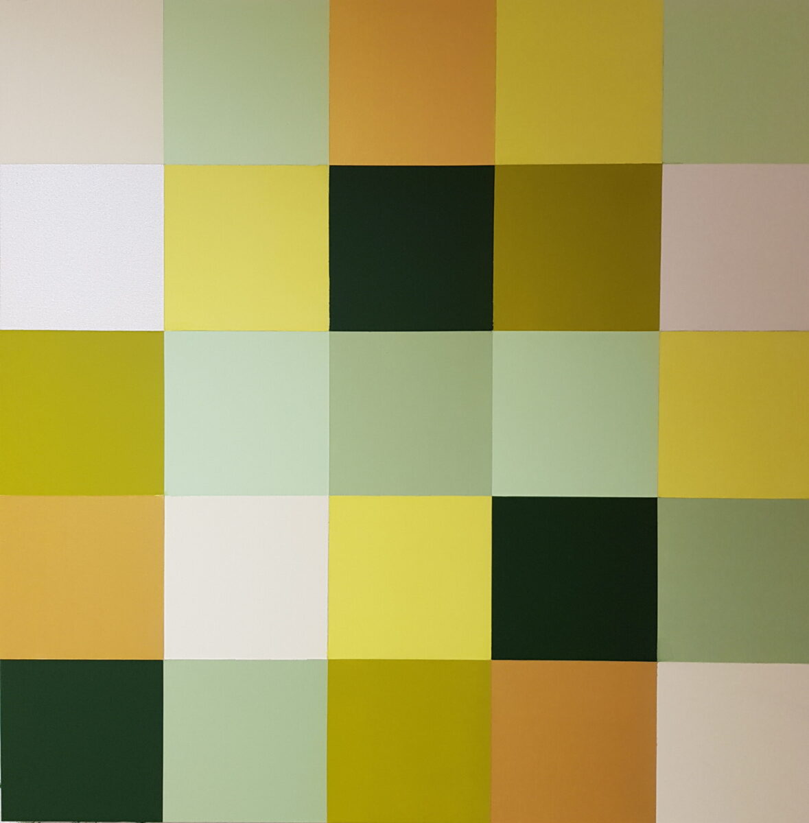 Acrylmalerei auf Leinwand, die in einem Quadratraster von 5 x 5 Unterquadraten mehrere Spannungsaufgaben konstruktiv aufzulösen sucht : Den Farbe-an-sich Kontrast, den Hell-Dunkel Kontrast – sowie durch unterschiedliche Anzahl der verschiedenfarbigen Untergruppen den Quantitativkontrast. Durch Anordnung der Teilflächen einer ausgewählte Farbuntergruppe zu einer primären Figur, die in harmonischem oder kontrastiv-dynamischem Spannungsverhältnis zu dem Grund der sie umgebenden sekundären Teilflächen steht, ergibt sich die Gesamtkomposition