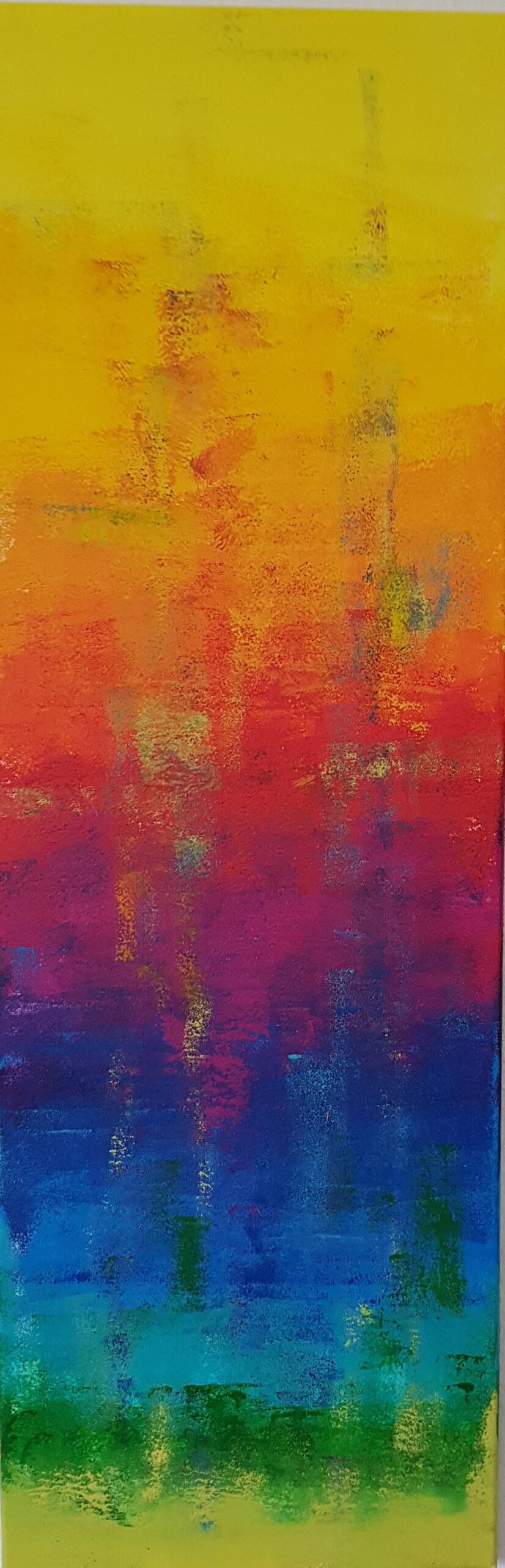 Freie Abstraktion mit den leuchtenden Zwölftonfarben – in der Farbenkreisfolge untereinandergesetzt – mit einer angedeuteten Struktur nur leicht übertouchiert