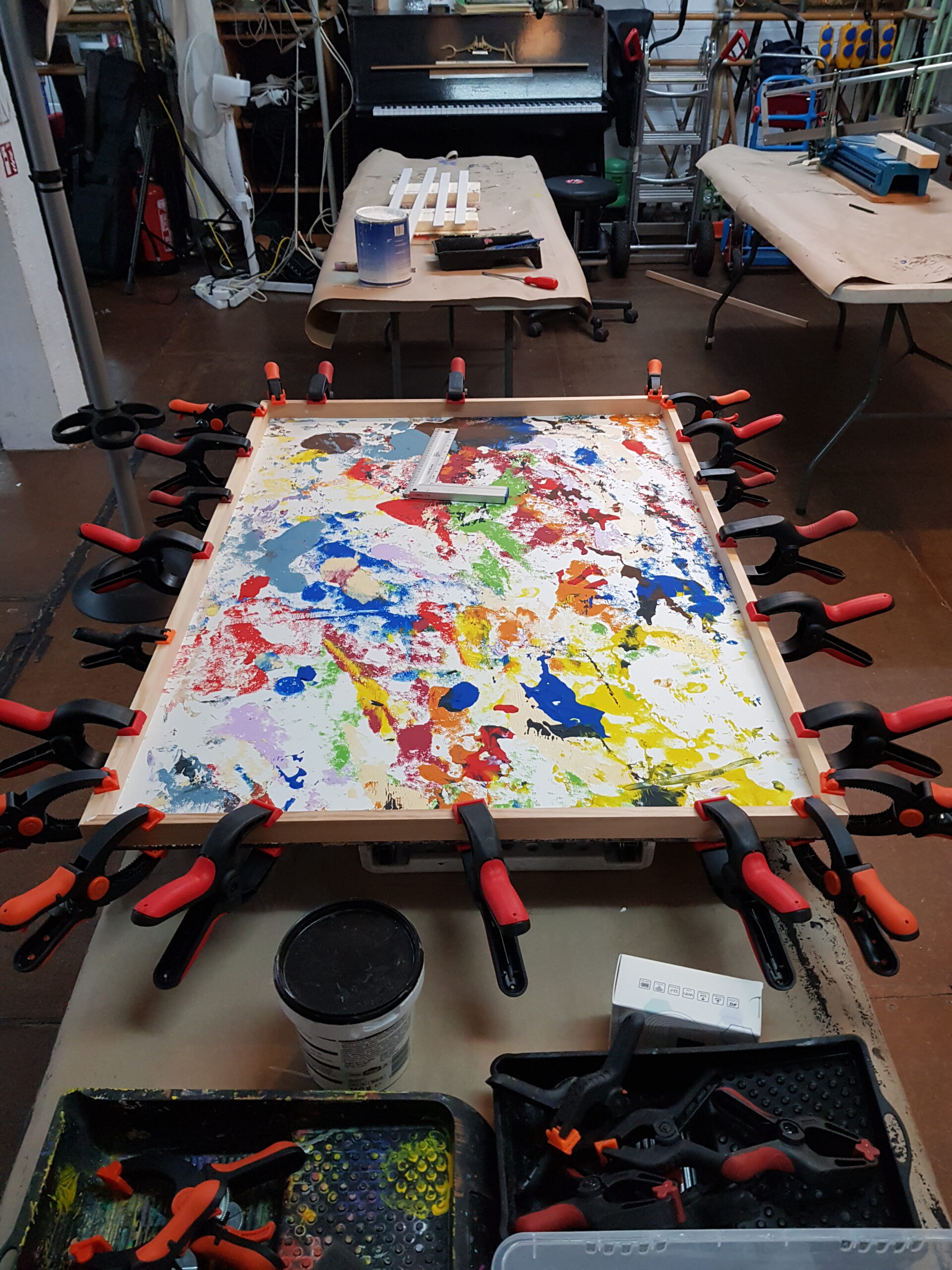 Dieses Foto zeigt die Anfertigung der Festrahmen, mit denen ich arbeite, wenn das Bildwerk auf HDF- Trägerplatte produziert wird.
