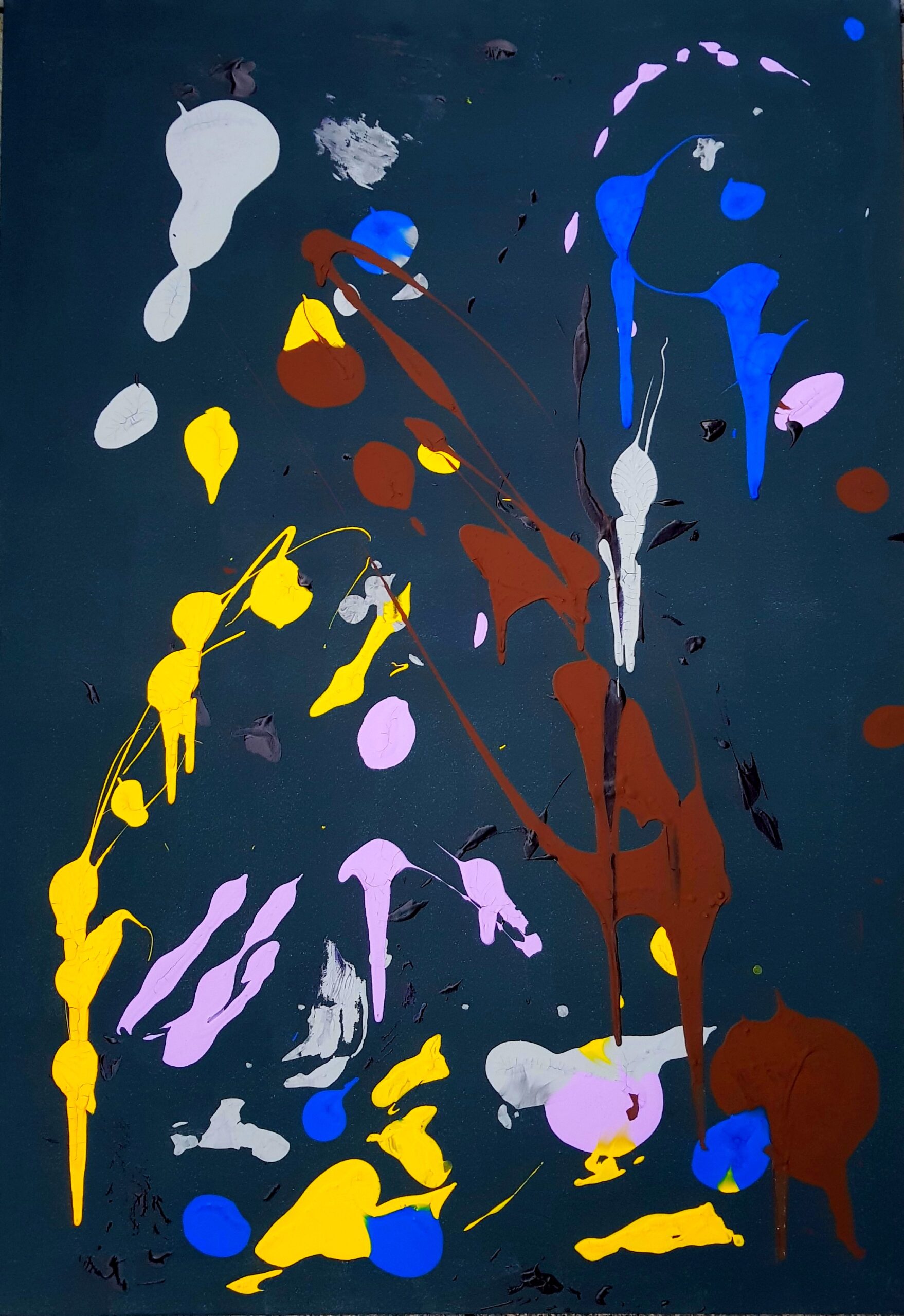 Acrylfarbe satt aufgeschleudert, was eine reliefartige Oberfläche aus Farbkörpern ergibt