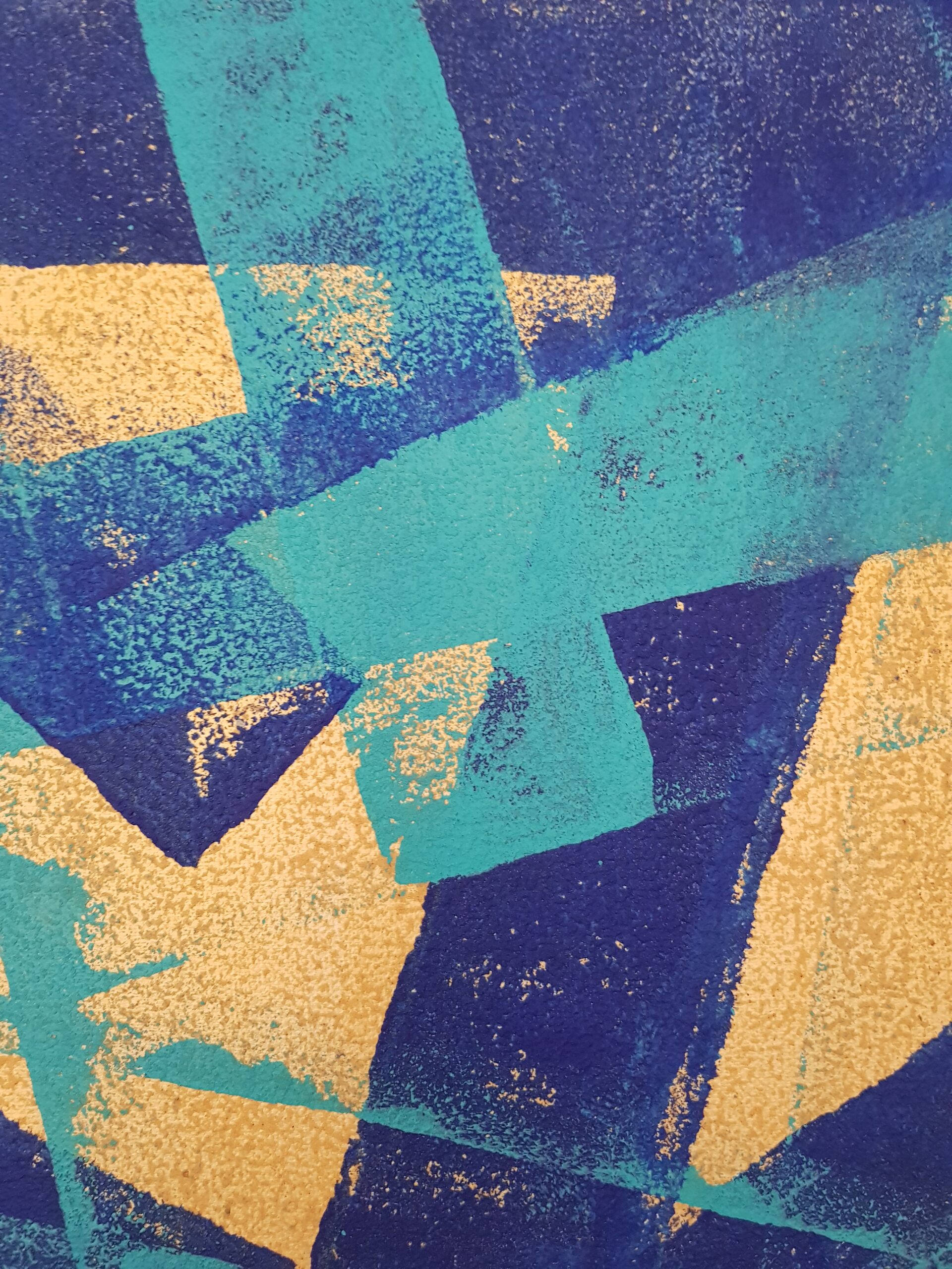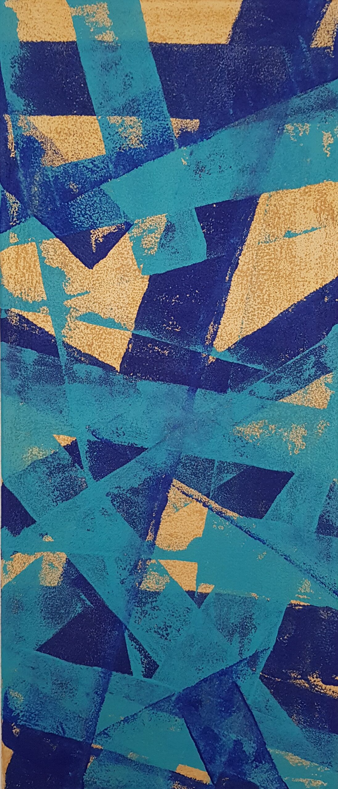 Abstraktes Motiv – Streifen in freien Winkeln mit unterschiedlicher Dichte -Ultramarin und Türkis auf Acryl-Goldgrund mit Feinsand