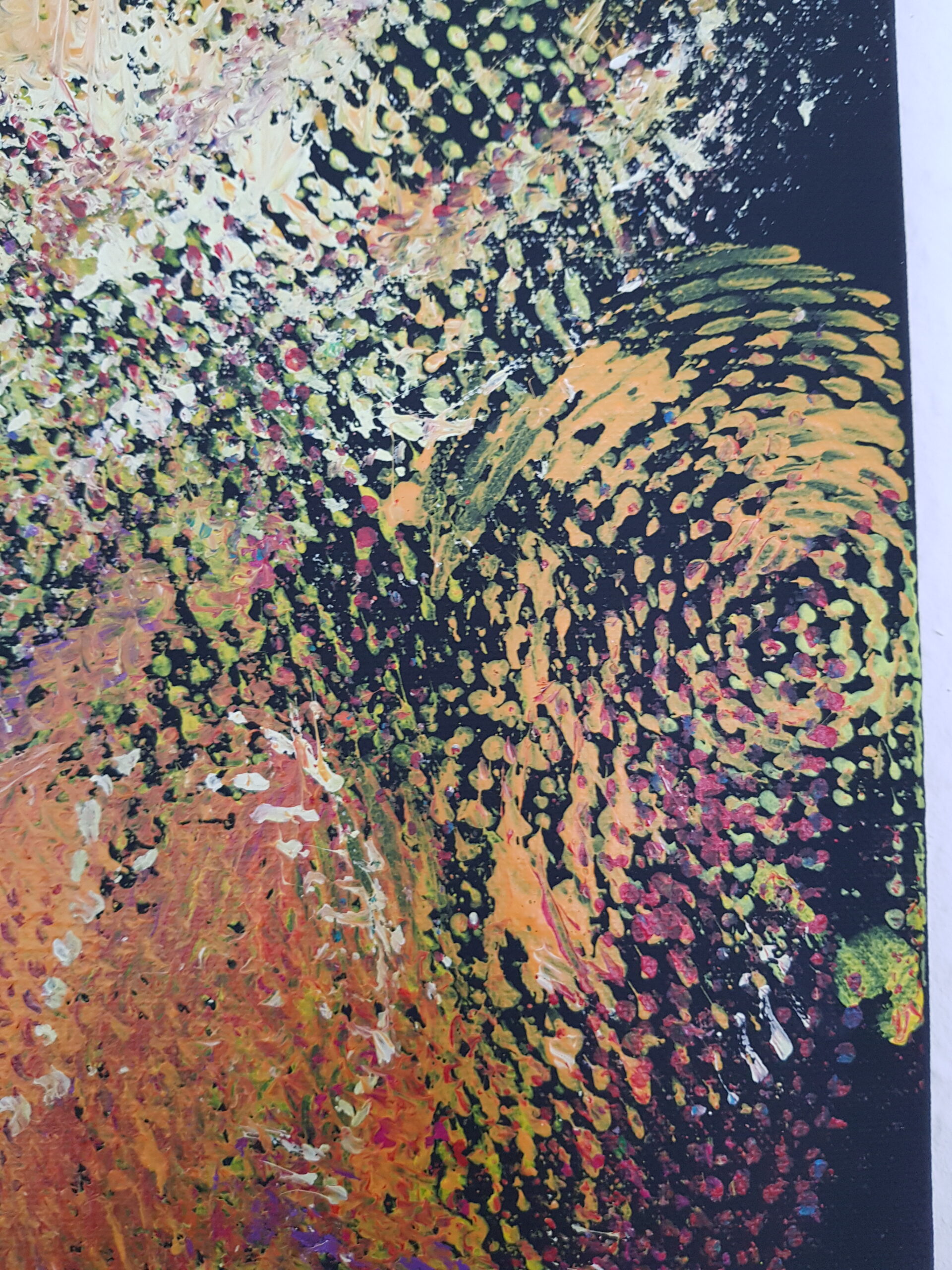 Freie tachistische Komposition auf schwarz grundiertem bespanntem Keilrahmen 50x70x1,6cm