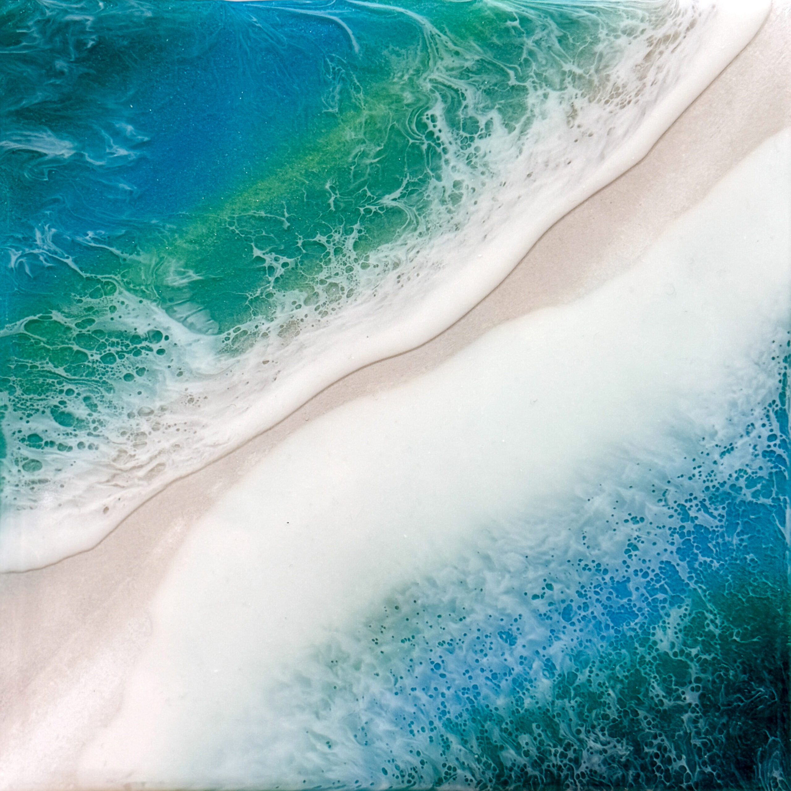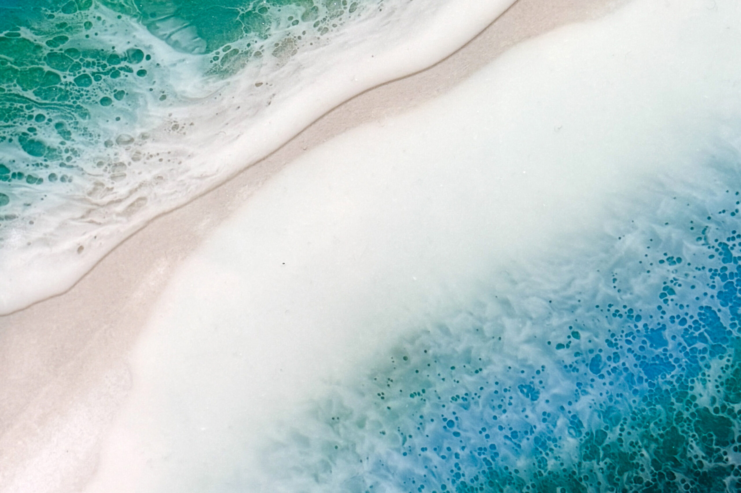 Die Rahmen werden in liebevoller Handarbeit einzeln gesägt, geklebt, geschliffen und versiegelt. Mit Acrylfarben, Pinseln und Schwämmen schaffe ich darauf einen Untergrund, der die Faszination des Meeres in harmonischen Farbtönen widerspiegelt. Jeder Pinselstrich erzählt eine eigene kleine Geschichte. Durch den Einsatz von Epoxidharz, Pigmenten, flüssigen Inks und teilweise Strukturpaste bekommen die Werke ihre Tiefe und durch das Gestalten der Wellen wird die Magie des Ozeans erweckt.
