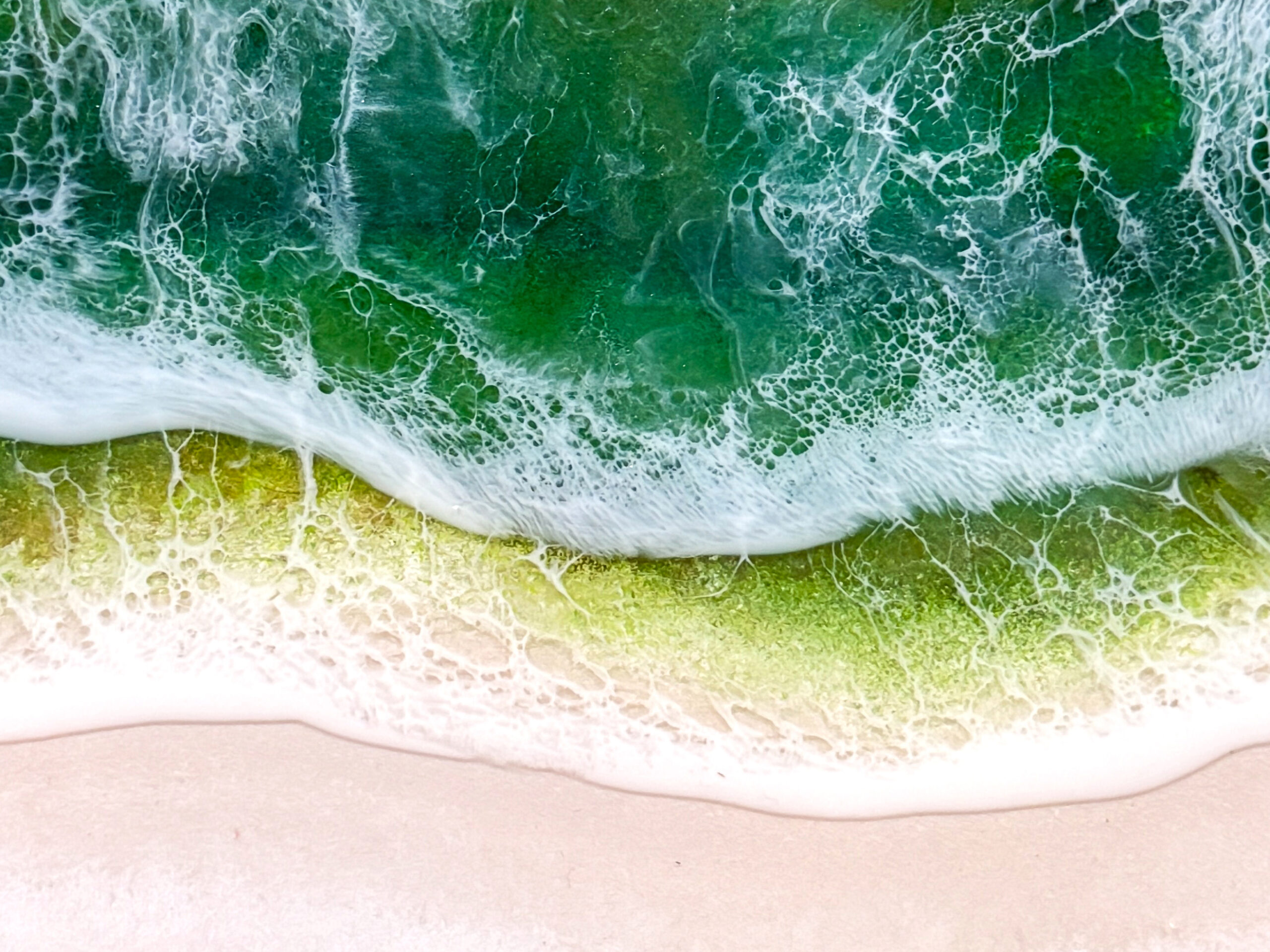 Dieses Werk entführt in die geheimnisvolle Tiefe eines grünen Meeres, in dem dunkle, mystische Grüntöne verschmelzen. Das Wasser wirkt kraftvoll , tief und zeitgleich geheimnisvoll, als würde es unentdeckte Welten unter der Oberfläche verbergen. Die mehreren Schichten aus Epoxidharz erzeugen eine faszinierende Tiefe: Transparente Bereiche lassen Licht sanft durch die grünen Nuancen brechen, während dunklere Töne die mystische Stimmung verstärken. Kleine Strukturen und Wellenbewegungen verleihen dem Werk Dynamik, ohne die ruhige, geheimnisvolle Atmosphäre zu stören.