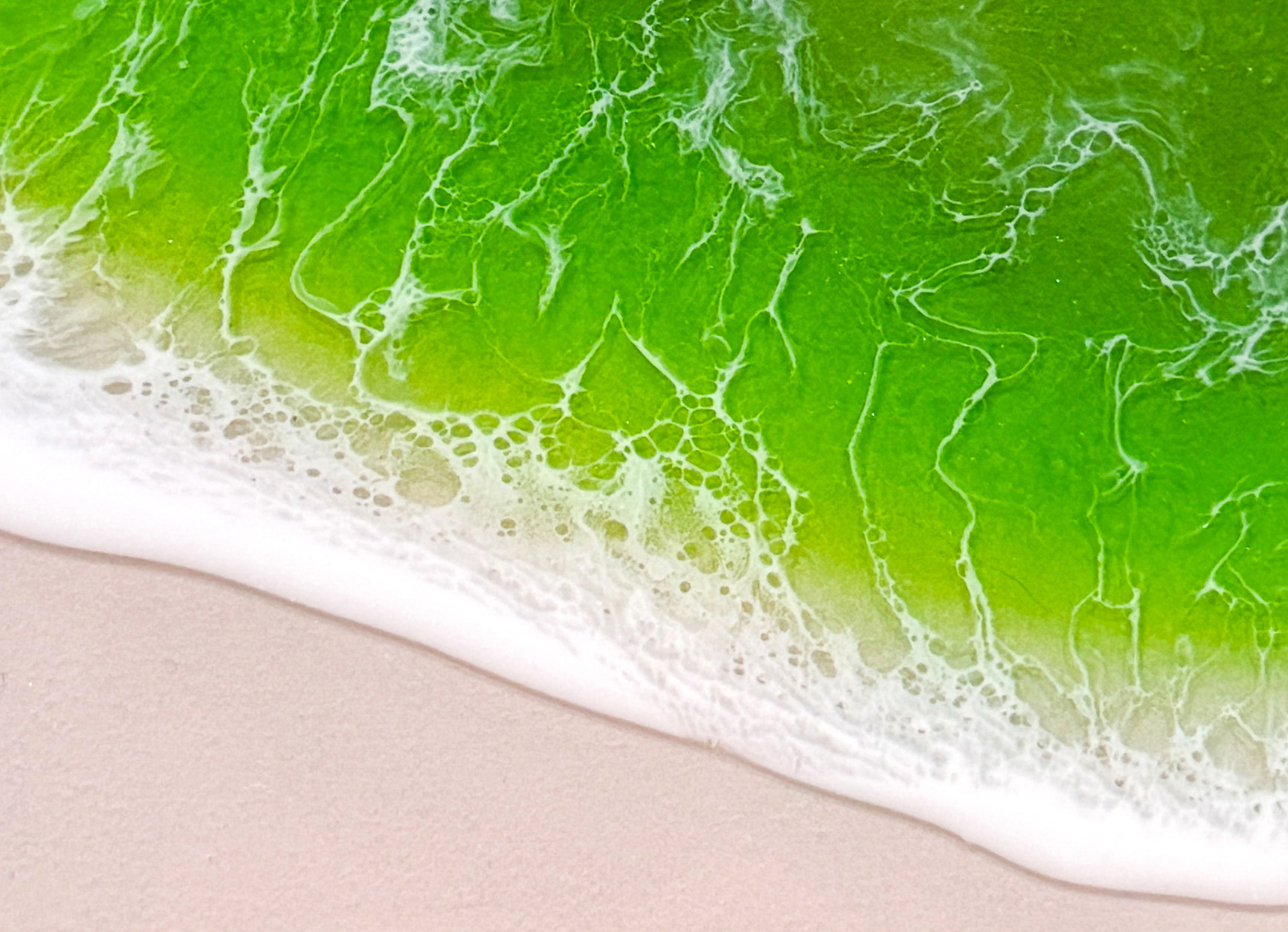 Das Werk entführt an einen tropischen Strand, an dem das Wasser in leuchtenden, klarem Grün erstrahlt. Sanfte Wellen rollen über feinen Sand und lassen die lebendigen Smaragdnuancen des Meeres in der Sonne schimmert. Die vielen transparenten Schichten des Epoxidharzes schaffen eine außergewöhnliche Tiefe: Licht durchdringt das grüne Wasser, reflektiert auf der Oberfläche und verstärkt den Eindruck von Klarheit und Frische. Weiß schäumende Wellen setzen lebendige Akzente und lassen die Bewegung des Wassers spürbar machen.