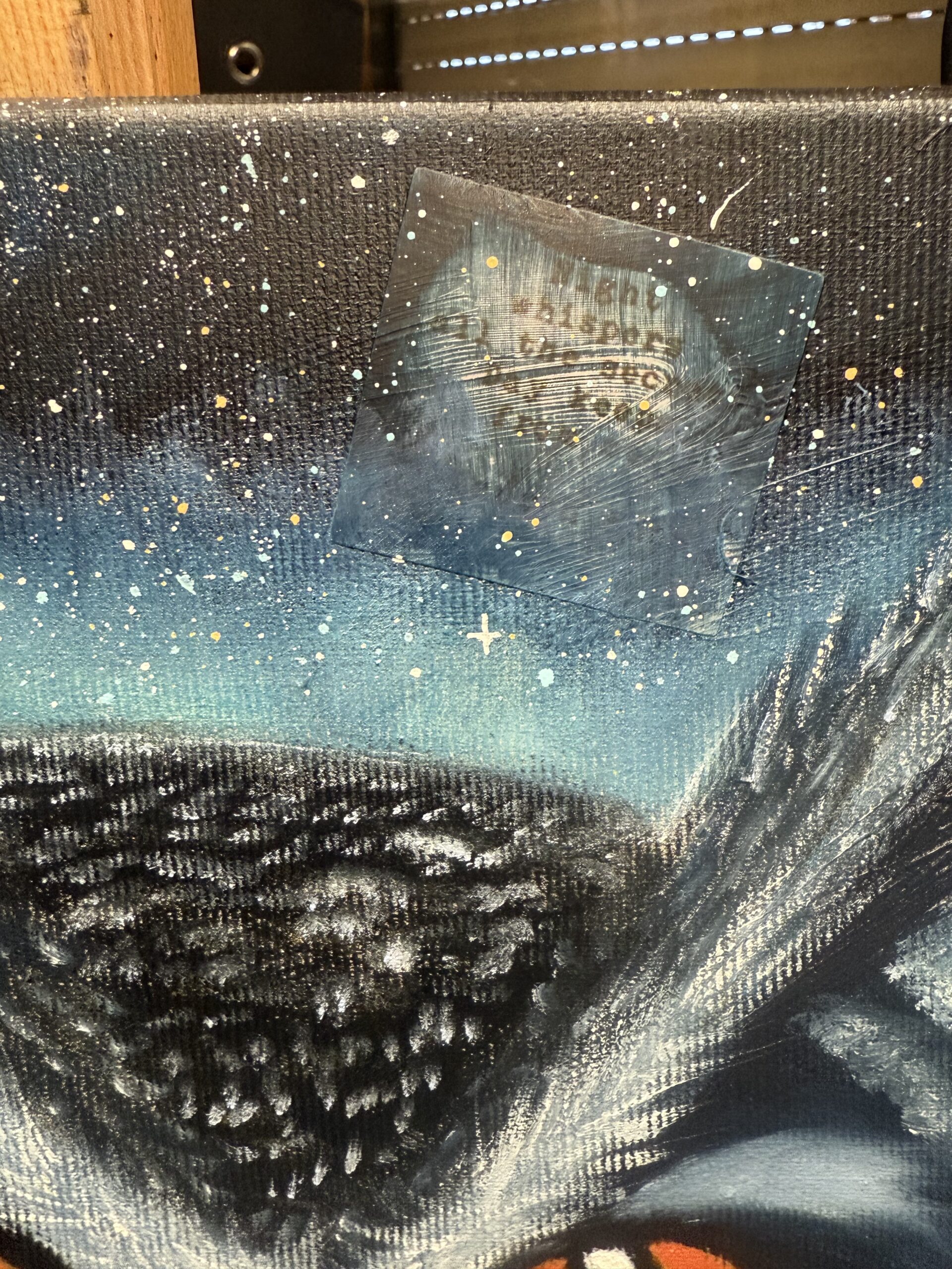 Eyes of the Night ist ein stilles, intensives Werk über Achtsamkeit, Präsenz und den tiefen Respekt vor dem Lebendigen. Eine Eule erscheint aus dem Dunkel des Waldes – nur ihre feurigen Augen leuchten und treffen den Betrachter mit durchdringender Klarheit. Der Sternenhimmel hinter ihr verstärkt den Kontrast aus Schatten und Licht, Instinkt und Erkenntnis. Dieses Gemälde ruft nicht zur Moral – sondern zu innerer Haltung. Denn Respekt vor dem Leben beginnt nicht mit dem Gesetz, sondern im Herzen.