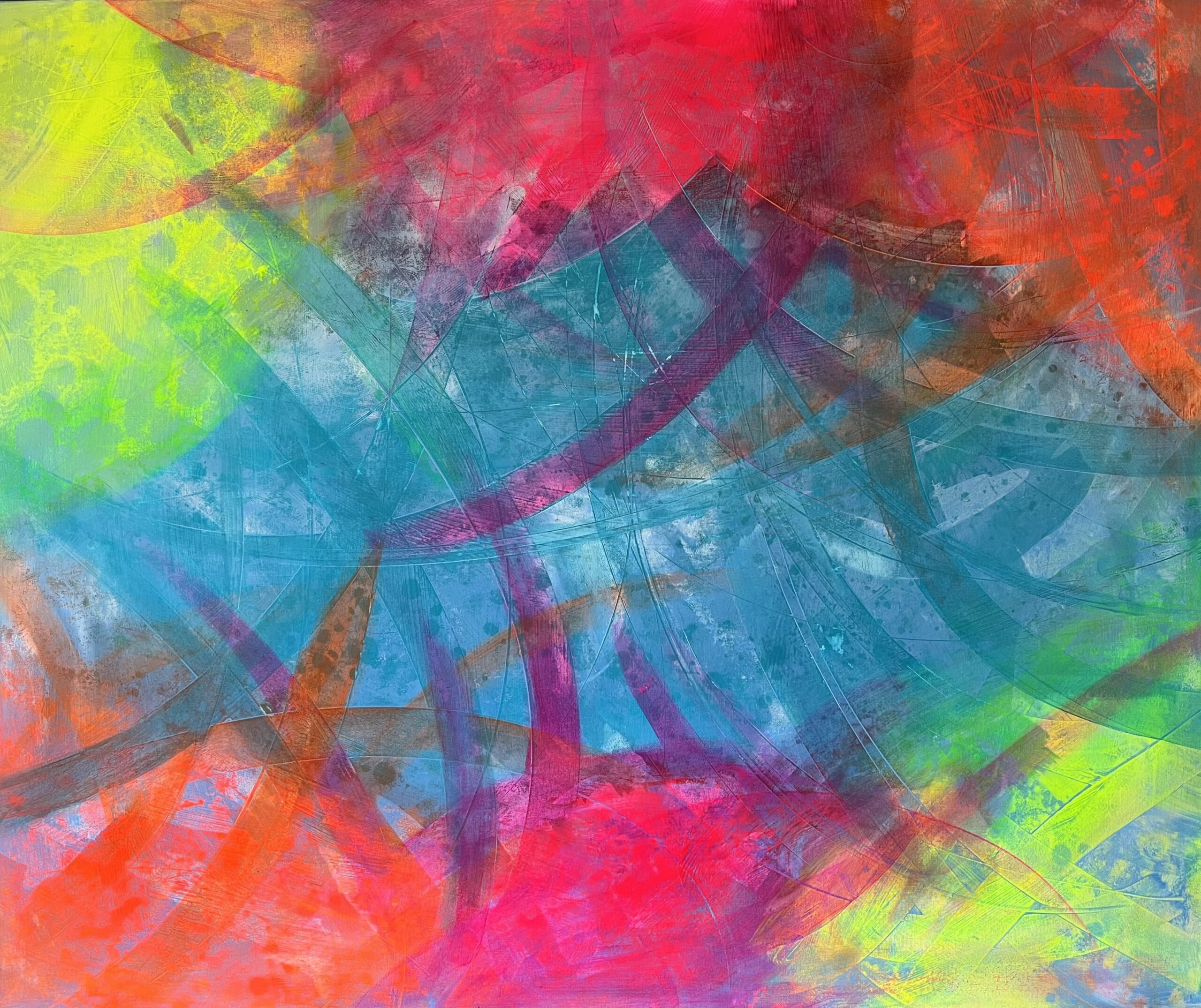Dieses Werk ist ein pulsierendes Farbspektakel, das die Grenze zwischen sichtbarem Licht und energetischer Wahrnehmung auslotet. Die dynamischen Überlagerungen aus Neonpink, Türkis, Zitronengelb und elektrisierendem Orange erzeugen eine vibrierende Tiefe – wie ein abstraktes Echo urbaner Rhythmen.