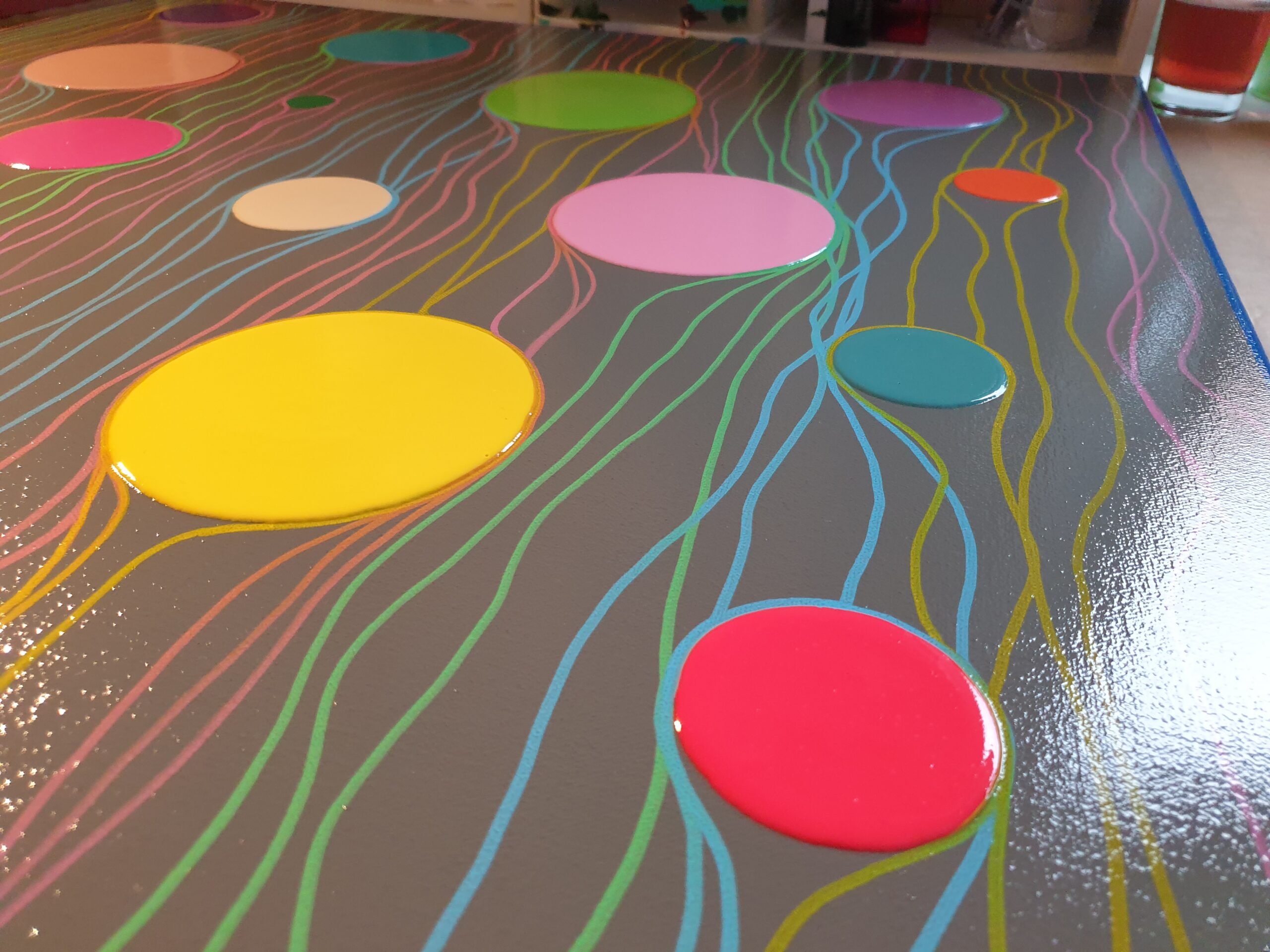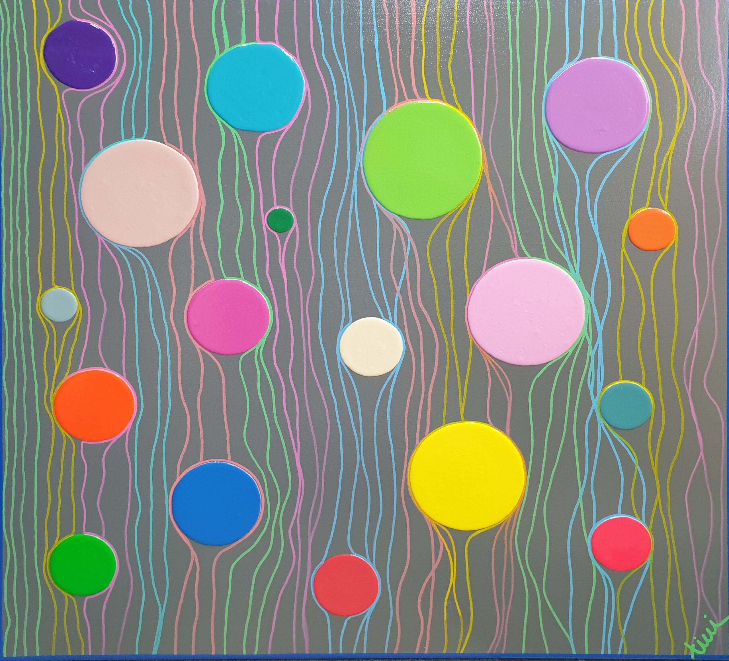 Mit diesem Werk fängt die Künstlerin die Lebendigkeit und Freude des Lebens ein. Die bunten Punkte schweben wie kleine Energiekugeln auf einem ruhigen grauen Hintergrund – sie symbolisieren Vielfalt und Dynamik. Die fließenden Linien verbinden alles zu einem harmonischen Ganzen, das positive Energie in jeden Raum bringt und zum Träumen anregt. Dieses Bild wird Ihr Zuhause mit Farbfreude und optimistischer Kraft erfüllen!