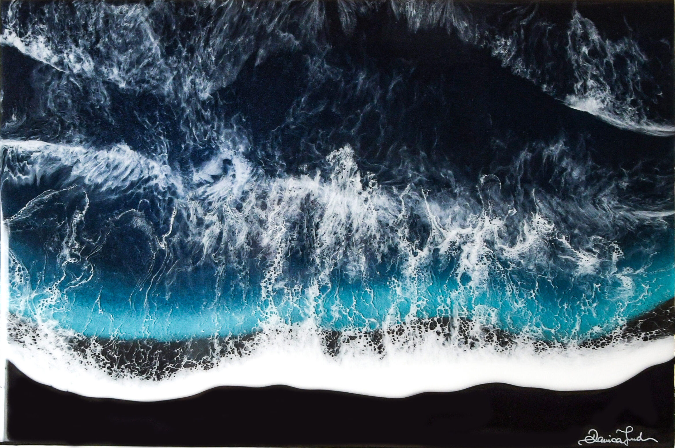 Dieses Werk ist eine Hommage an die raue und ungezähmte Schönheit der „Nature Island“ Dominica. Eingebettet zwischen dichtem Regenwald, vulkanischen Felsen und der unendlichen Weite des Atlantiks, zeigt dieser schwarze Strand die ursprüngliche Seite der Karibik – kraftvoll, geheimnisvoll und zutiefst lebendig. In vielschichtigen Gussverfahren aus Acrylfarben, Pigmenten und Epoxidharz wird die charakteristische Dynamik des Ortes eingefangen: dunkler Sand, gebrochene Wellen, schimmernde Gischt und das warme Licht tropischer Sonne. Das Werk vereint Bewegung und Ruhe, Licht und Tiefe – ein Sinnbild der natürlichen Balance, die Dominica so einzigartig macht.