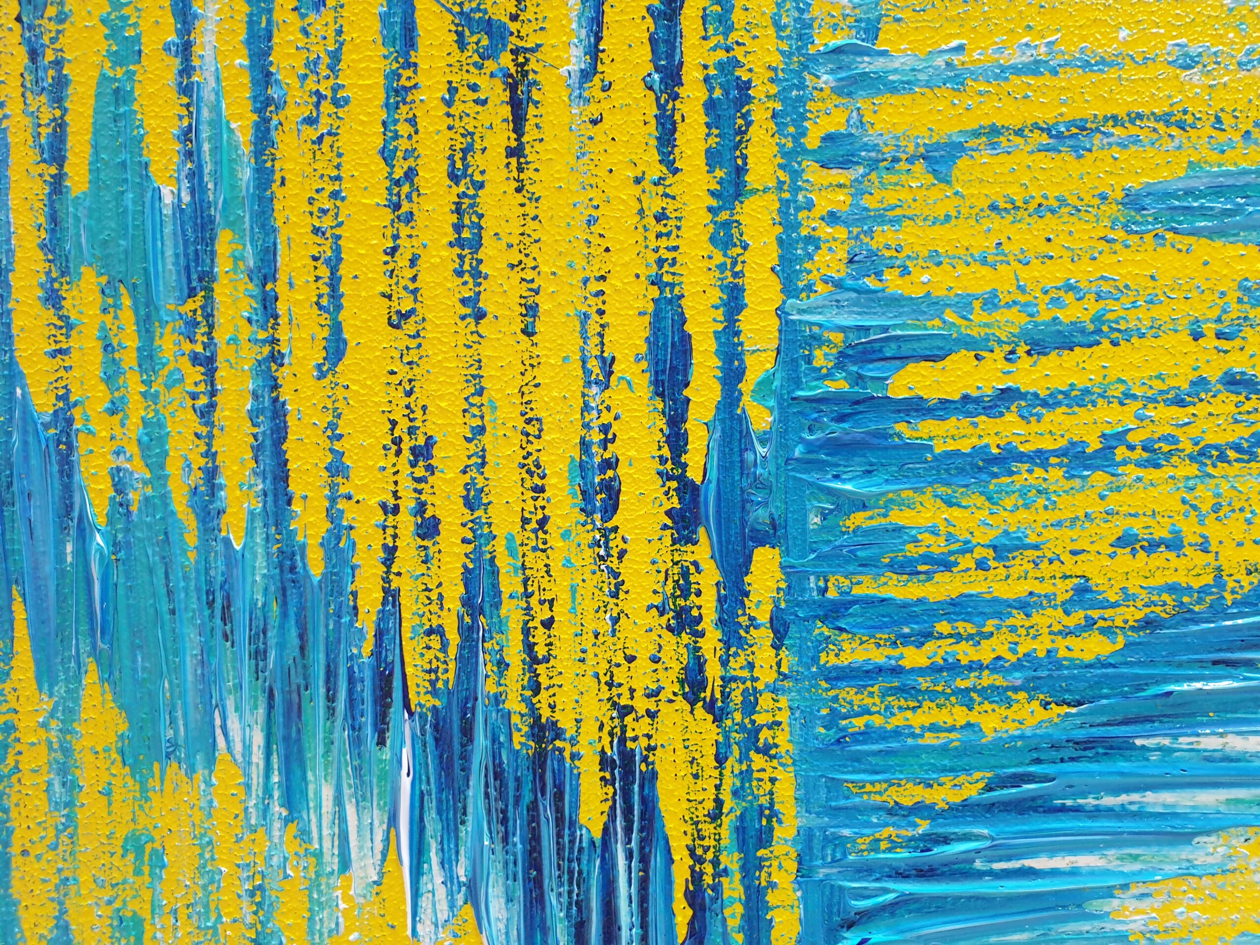 Dieses Werk verschmilzt kräftige, lebendige Farben und dynamische Texturen, um die pulsierende Energie und die tiefen Emotionen des menschlichen Herzens darzustellen. Die Entscheidung für kräftiges Gelb und intensives Blau in Acryl schafft einen starken Kontrast, der die Aufmerksamkeit anzieht und zugleich eine tiefe Sehnsucht und Leidenschaft verkörpert. Dieses Gemälde wird jeden Raum mit seiner energiegeladenen Aura und seinem kraftvollen Ausdruck von Hoffnung und Lebendigkeit erfüllen.