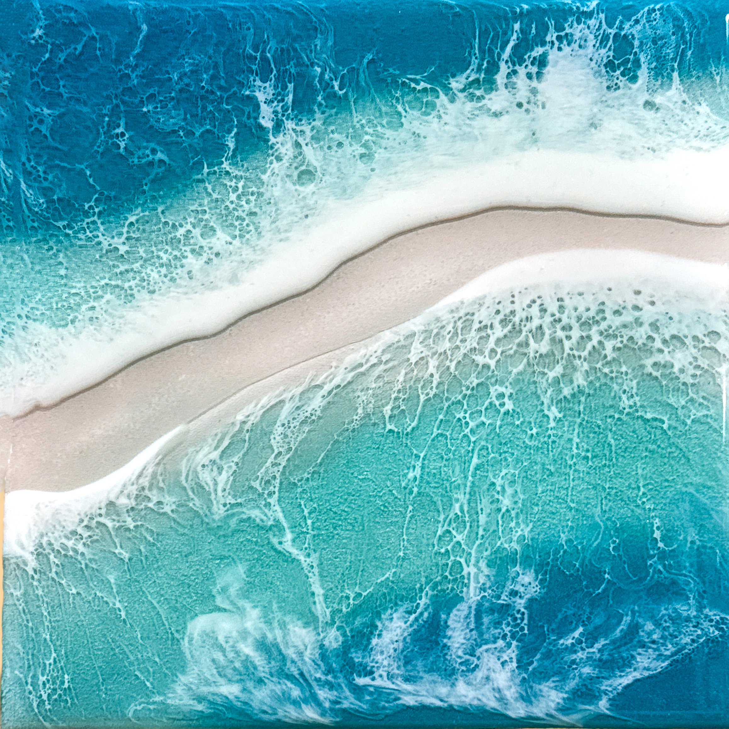 Das Werk entführt in eine stille, fast magische Szene: eine einsame Sandbank, umgeben von türkis- und blau schimmerndem Wasser, das in sanften Wellen glitzert. Die Komposition strahlt Klarheit, Ruhe und fast meditative Leichtigkeit aus. Unter der glatten Oberfläche des Epoxidharzes verschmelzen die Farben zu einem transparenten, leuchtenden Ganzen. Helle Türkisnuancen treffen auf tiefere Blautöne und erzeugen die Illusion von flachem, kristallklarem Wasser, das sanft um die Sandbank fließt. Die subtilen Reflexe fangen das Licht ein und verstärken den Eindruck von Leichtigkeit und Weite.