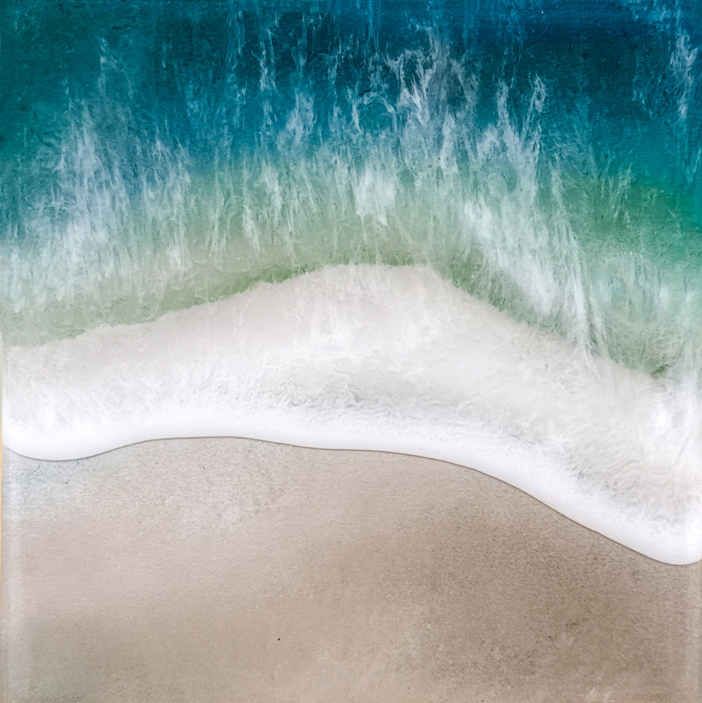 Das Werk fängt die kraftvolle, klare Energie nordischer Gewässer ein. In kühlen Blau-Grautönen pulsiert das Wasser in steter Bewegung – mal ruhig und meditativ, mal dynamisch und kraftvoll. Die vielen Schichten aus Epoxidharz verleihen dem Werk Tiefe und Transparenz: Lichtreflexe spielen auf der Oberfläche, während dunklere Bereiche die unvorhersehbare Weite des Meeres andeuten. Kleine Strömungen und sanfte Wellen erzeugen einen subtilen Rhythmus, der die nordische Küstenlandschaft lebendig werden lässt.