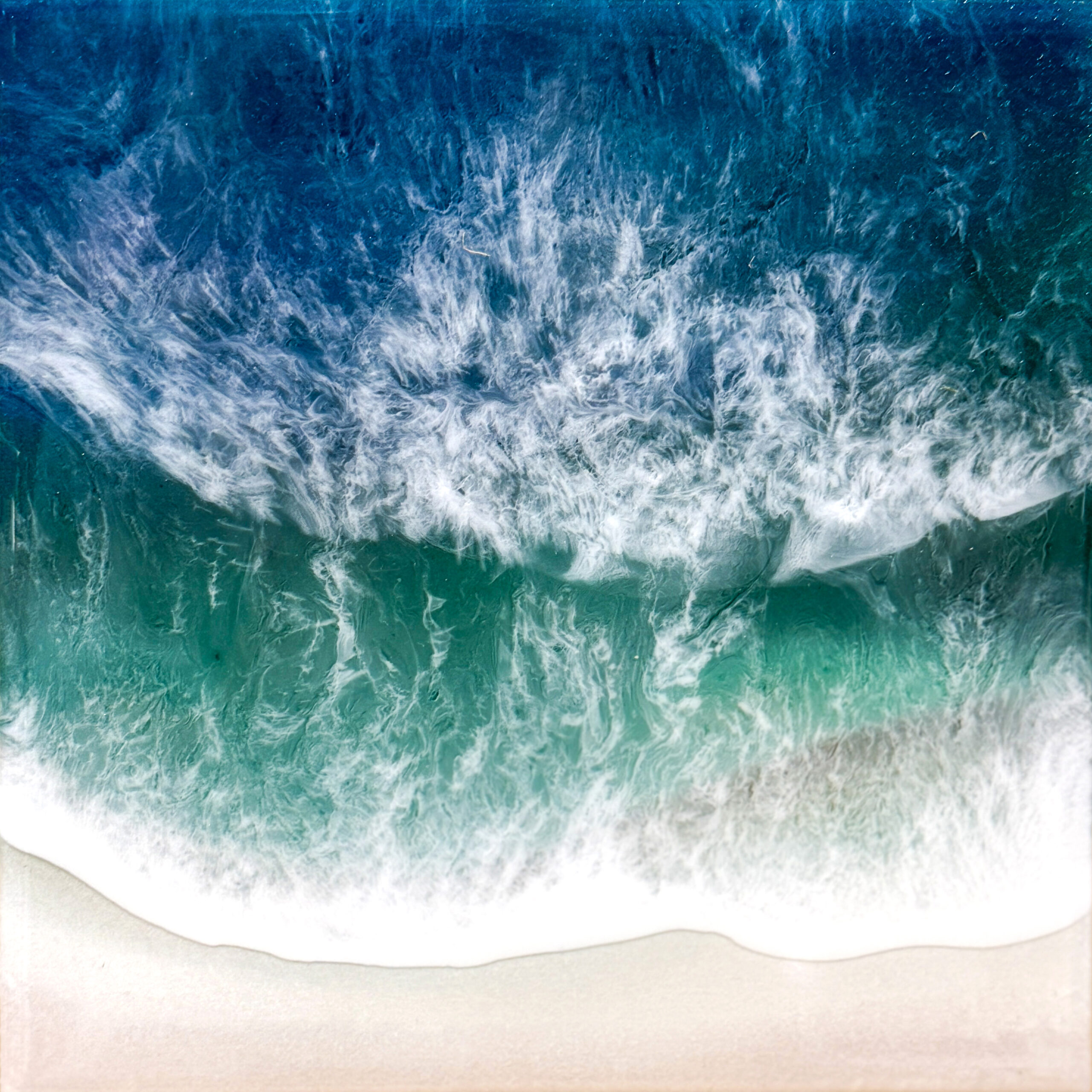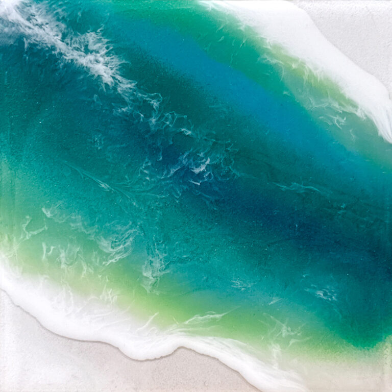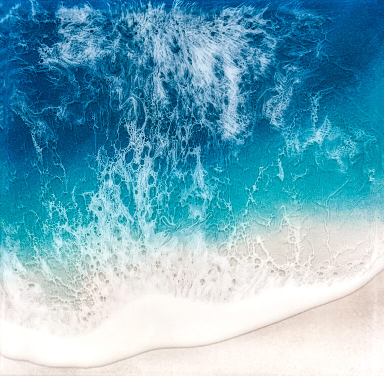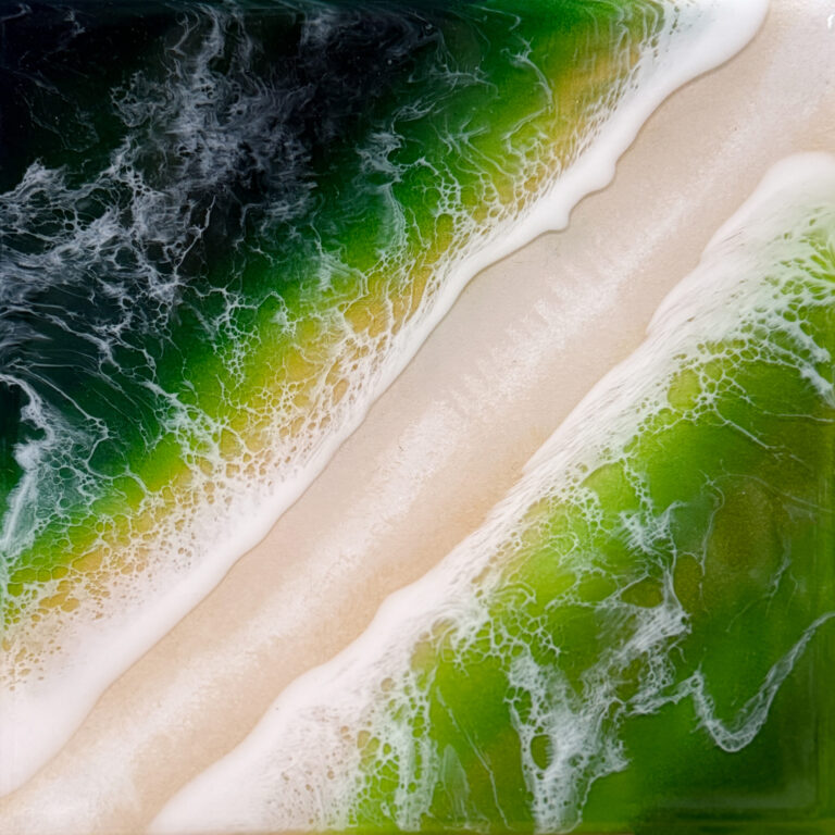 Dieses Werk spürt dem Atem des Meeres nach – rau, lebendig und voller ungebändigter Energie. In intensiven Smaragd- und tiefen Blautönen entfaltet sich eine bewegte Komposition, die an aufgewühlte Wasseroberflächen und das kraftvolle Aufeinandertreffen von Wellen erinnert. Die vielschichtigen Ebenen aus Epoxidharz erzeugen eine eindrucksvolle Tiefe: Transparente Bereiche treffen auf verdichtete Farbräume, Licht bricht sich in den grünen und blauen Nuancen uns lässt das Werk je nach Perspektive immer wieder neu erscheinen. Die Struktur wirkt beinahe spürbar – wie Gischt, die sich im nächsten Moment wieder zurückzieht.