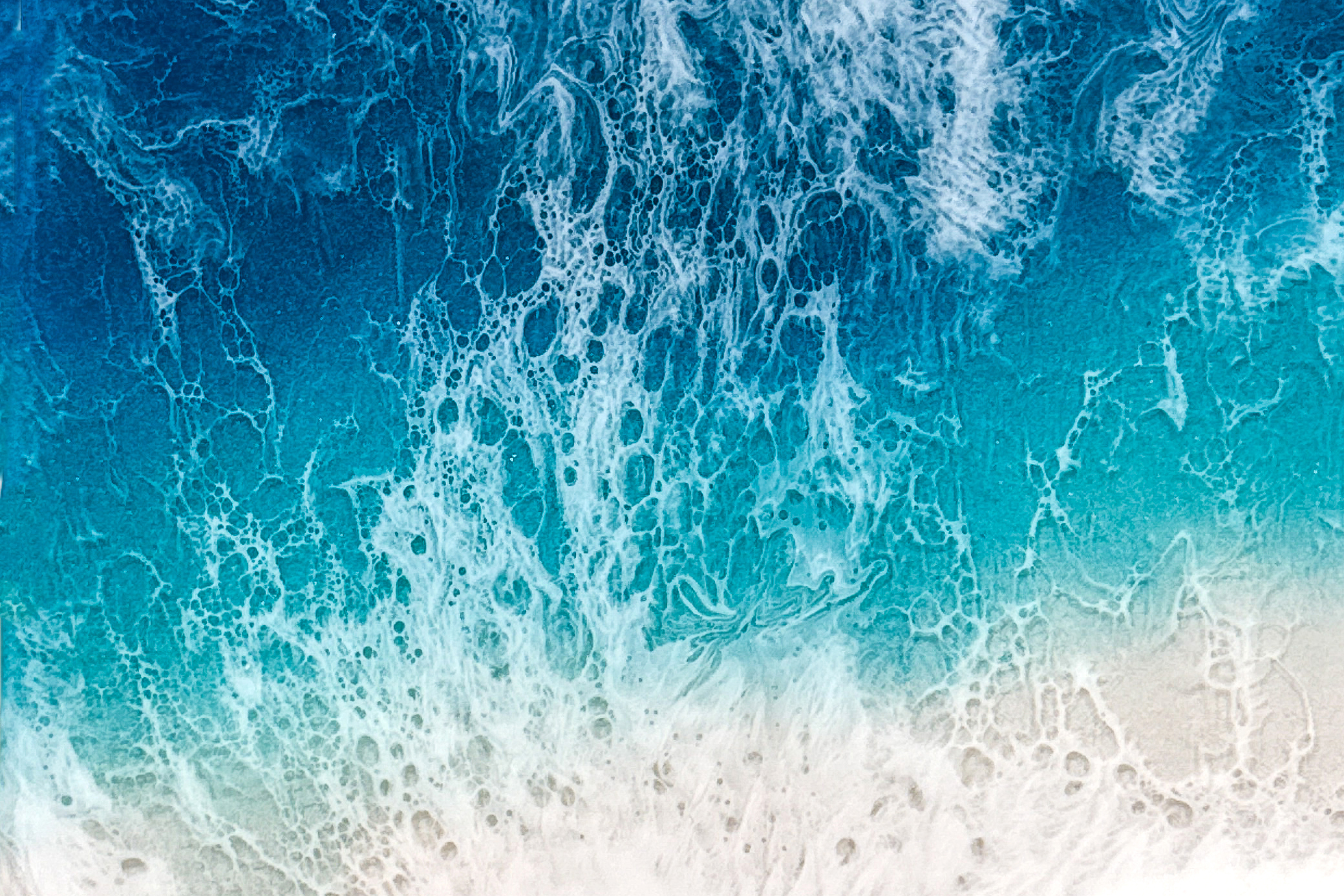 Das Werk fängt die lebendige Bewegung des Meeres in all seinen Facetten ein. In tiefen und leuchtenden Blautönen entfaltet sich eine dynamische Wasserlandschaft, in der Strömungen, Wellen und Lichtreflexe miteinander verschmelzen. Die vielen transparenten Schichten des Epoxidharzes erzeugen eine besondere Tiefe: Helle Reflexe glitzern wie Sonnenstrahlen auf bewegtem Wasser, während dunklere Farbnuancen die Kraft und die Weite des Ozeans betonen. Jede Welle wirkt lebendig, ein Moment der Dynamik, der im Betrachter die Energie des Meeres spürbar macht.