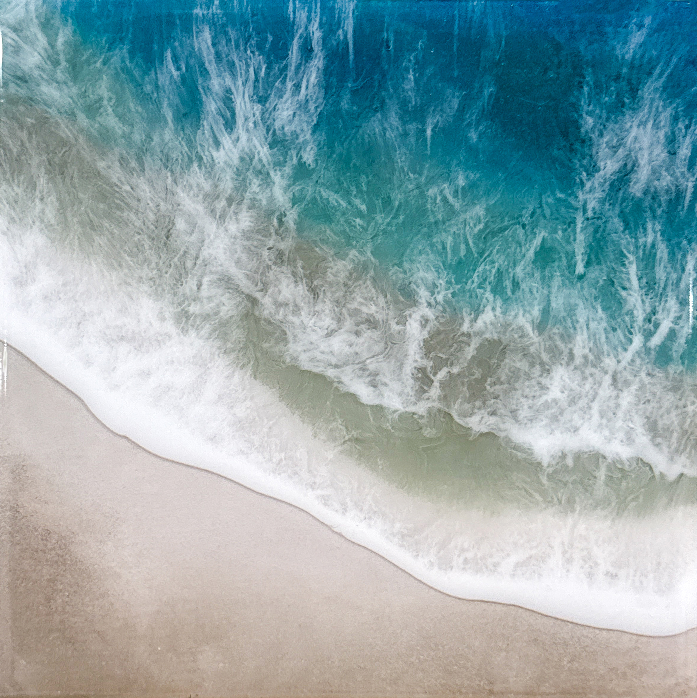 Das Werk fängt den kraftvollen Moment ein, in dem sich eine Welle aufbaut – voller Spannung, Bewegung und Energie. In leuchtenden Blau- und Türkistönen verdichtet sich das Wasser zu einer dynamischen Komposition, die Tiefe und Weite zugleich vermittelt. Unter der glasklaren Schicht des Epoxidharzes entstehen fließende Übergänge von hellem Türkis zu tiefem Ozeanblau. Die schäumenden, weißen Wellenkronen setzen lebendige Akzente und verleihen dem Werk eine spürbare Bewegung – als würde sich die Brandung im nächsten Augenblick weiter nach vorne tragen.