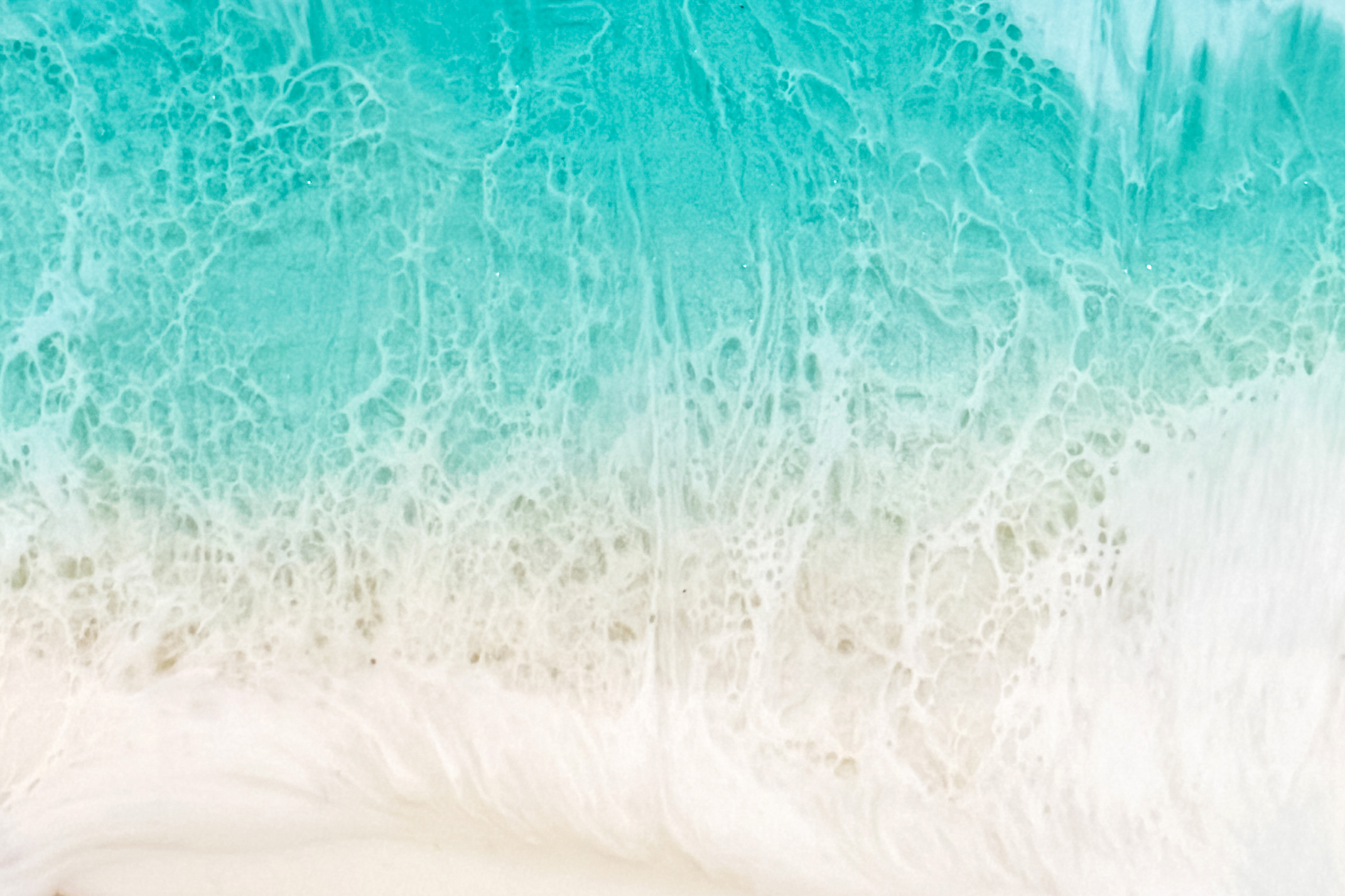 Dieses Werk fängt den stillen Moment ein, in dem das Wasser sich sanft über den flachen Sand legt und das Licht in schimmernden Bewegungen bricht. Zarte Türkis- und Sandnuancen verschmelzen unter der glänzenden Tiefe des Epoxidharzes.