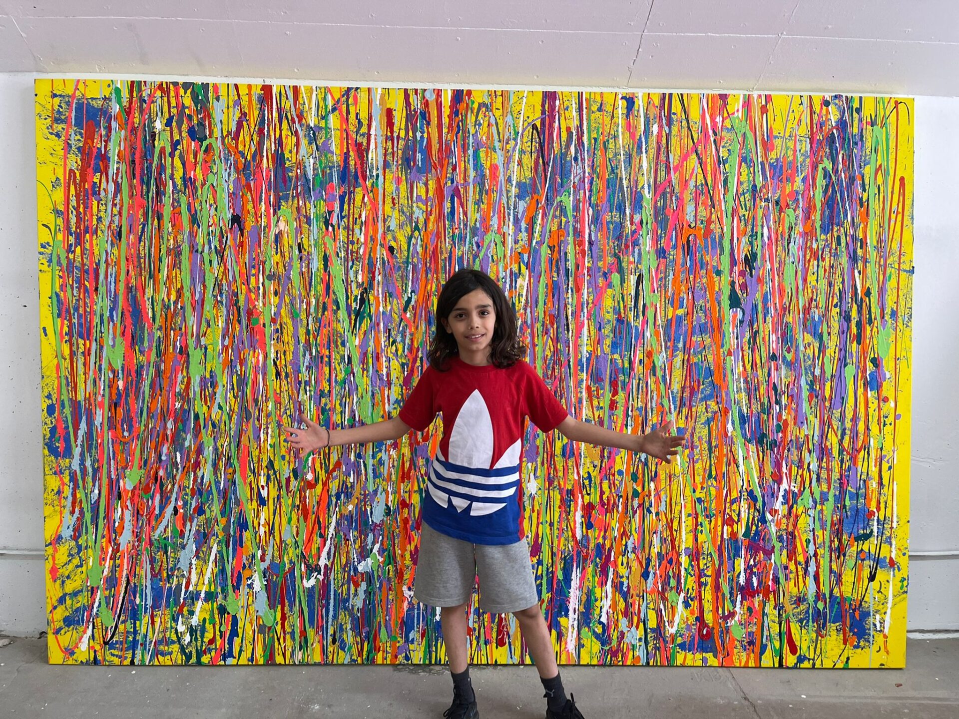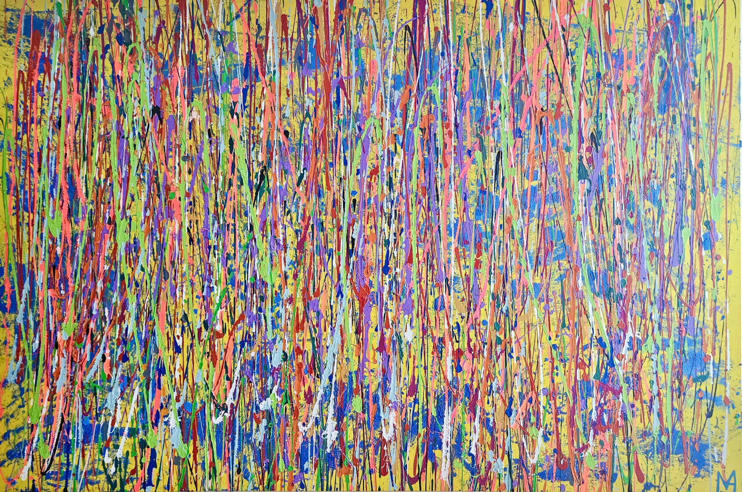 In diesem farbstarken großformatigen Werk zeigt Mikail Akar eindrucksvoll, wie das expressive Drip-Painting à la Jackson Pollock in eine zeitgenössische, jugendliche Bildsprache übersetzt werden kann. Mit leuchtenden Farben, fließenden Linien und einem scheinbar chaotischen Rhythmus entsteht eine dichte Komposition voller Energie und Bewegung.