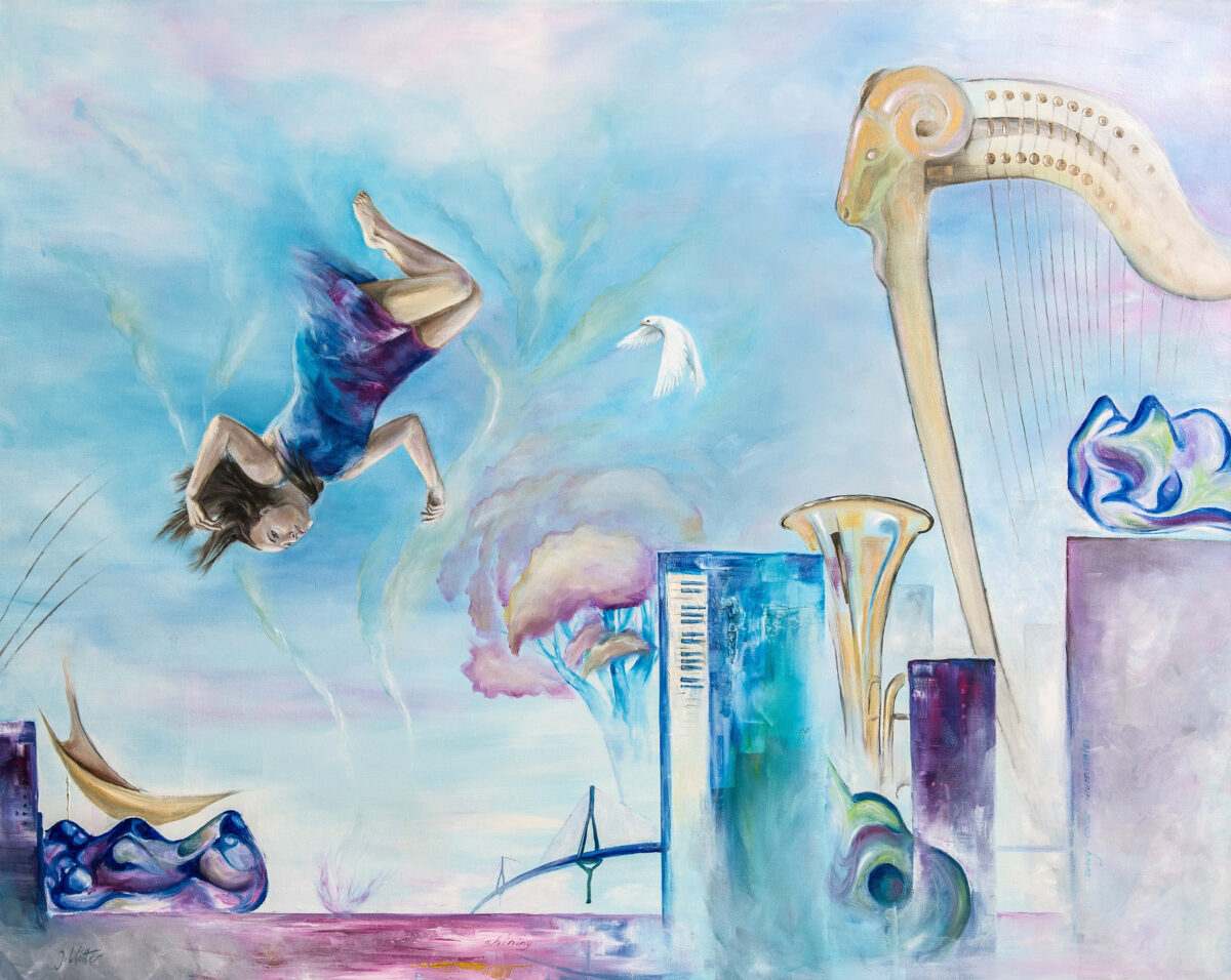 Hoffnungsvoll, neugierig, irgendwie zufrieden wirkt sie. Dieses Bild nimmt den Betrachter mit und hüllt ihn ein in eine positiv gestimmte Atmosphäre. Die Künstlerin verwendet nicht die für sie typischen kräftigen Farben, sondern geht hier über ins Pastellartige und unterstützt damit die friedlich-entspannente Bildstimmung.